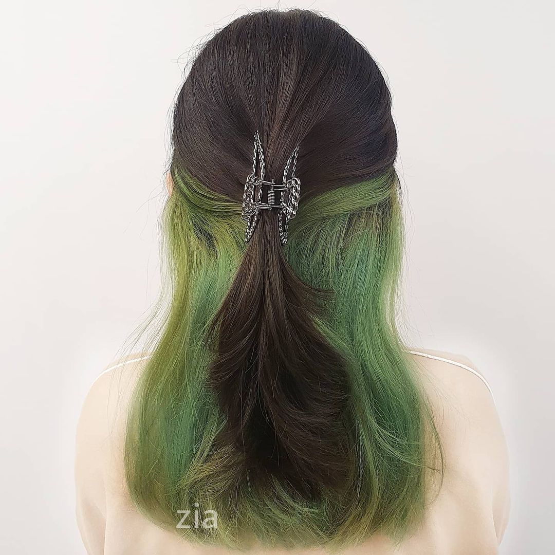 Inject dimension into the green portions by having different shades of green for your underlights. Plus, you’ll be able to choose from a variety of hairstyles to showcase the bold colour when you want to, and easily hide it as and when you like.