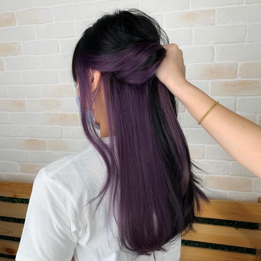 Dark purple underlights pair well with jet black hair, for those who don’t wish to get a full bleach.
