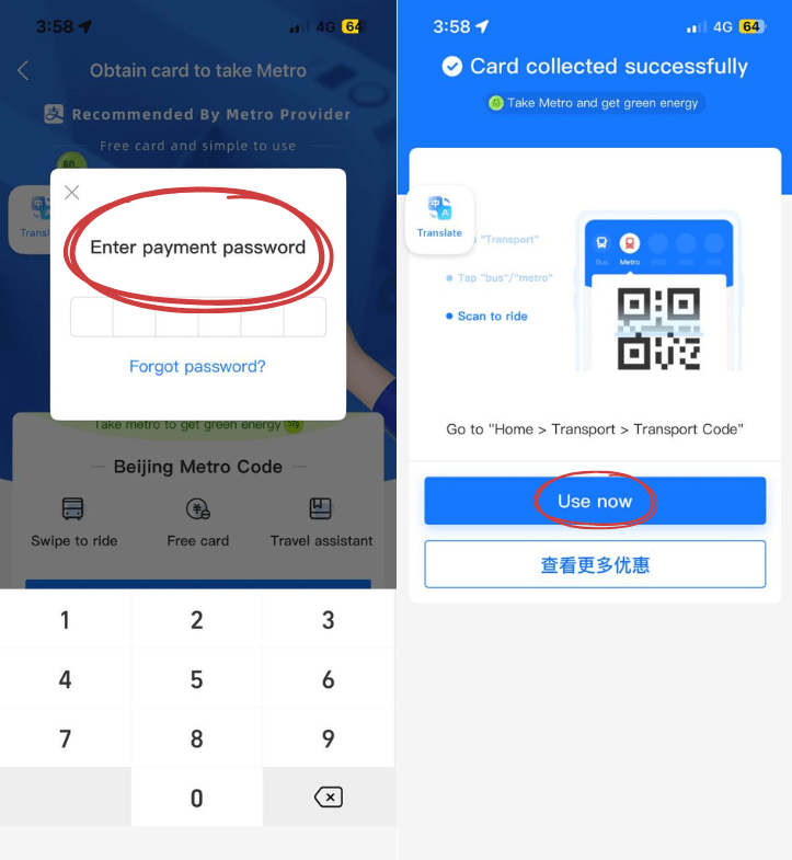 Enter your payment password if you have it set up, then tap on “Use now” to access a QR code. This code works like your digital transport card, which you’ll have to scan at the metro’s gantry when entering and exiting the station. The fare gets auto-deducted from your Alipay wallet or linked card. It’s a straightforward process – no need to queue at the station for tickets or top up your transport card like it’s 2005.