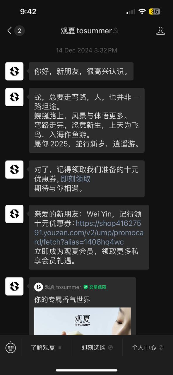 Automated messages that brands send to their WeChat members – usually updates on promos, new arrivals, or member perks.