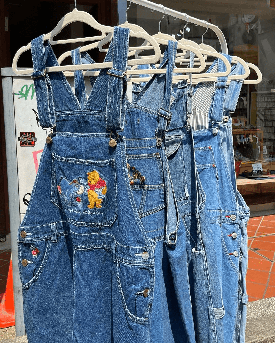 Denim overalls made from upcycled materials.