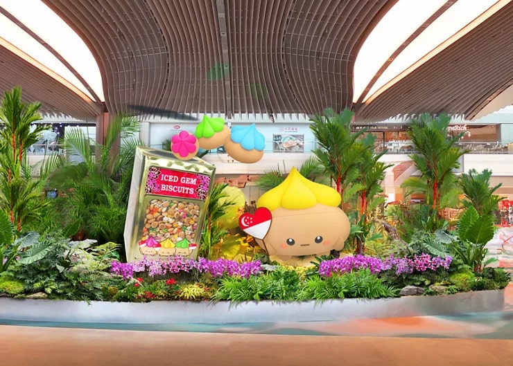 Catch a 270 sqm garden inspired by Singapore’s national flower, the Vanda Miss Joaquim, at Terminal 3. You’ll also find a 6-metre floral Merlion made using 60 different types of plants, standing tall beside the Wonderfall in Terminal 2. Cheeky floral displays featuring local snacks like curry puffs and iced gem biscuits will bring a fun, distinctly Singaporean twist to your stroll as well.