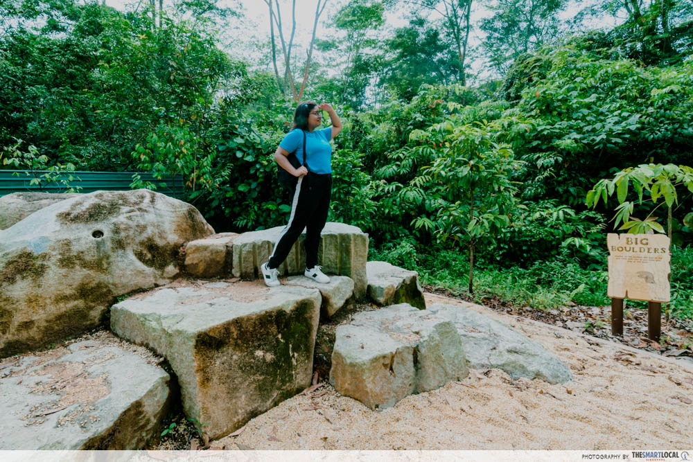 Budding rock climbers can venture a little further down the trail to find a collection of boulders which are safe to climb and perch on.