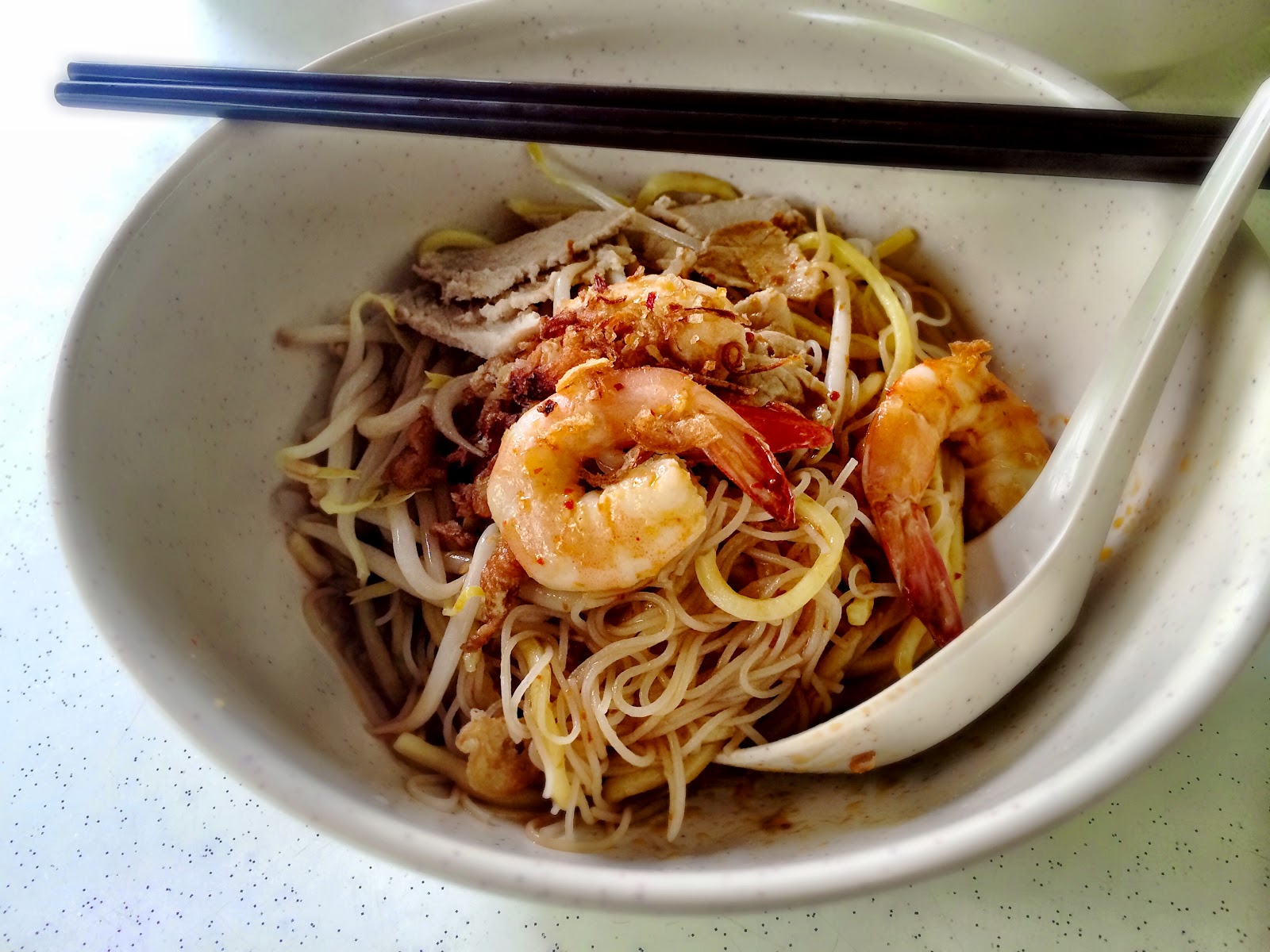 As the profit is not enough to cover for 3 people, my wife has to work outside while I manage the place. Penang Prawn Mee (Dry) Source